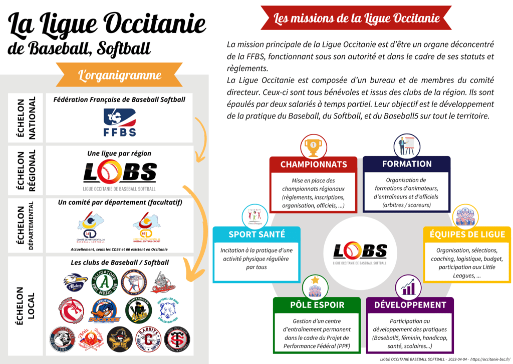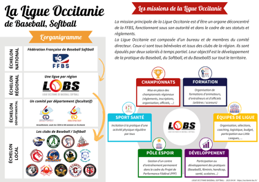 Elle est régie par la loi du 1er juillet 1901 et regroupe tous les clubs de la région Occitanie qui ont pour principal objectif le développement de la pratique du Baseball et/ou du Softball et/ou du Baseball5.